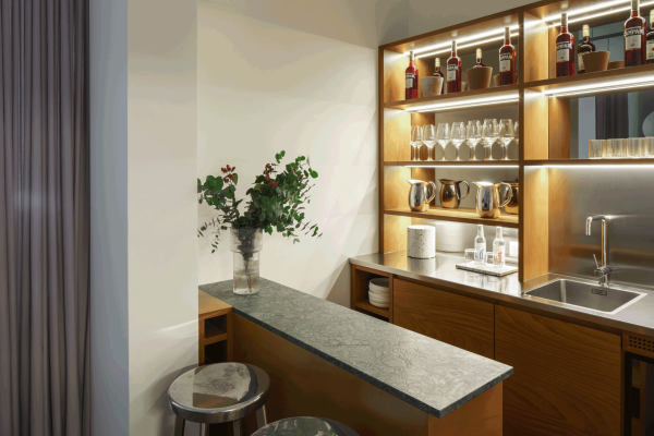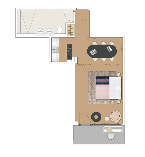 Fully stocked kitchen Private balcony with daybed upon request/availability Living area with lounge seating