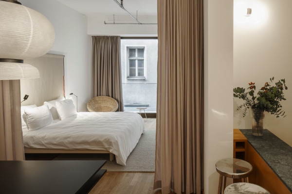 Window opens onto historic downtown Munich Functional and comfortable seating Smart TV with Apple TV and Android Connect